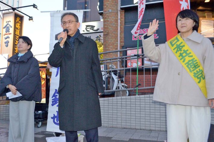 塩川氏は、高市早苗首相が物価高騰対策を最優先にするとしていたにもかかわらず、予算案の審議もせずに通常国会冒頭での衆院解散を狙っていると批判。雇用や暮らし、社会保障、平和などの問題で「総選挙は政治の流れを変える大きなチャンスです」と強調しました。